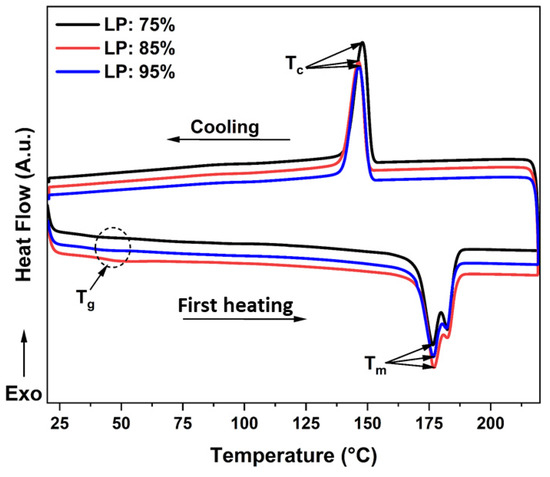 DSC thermograms of PA12 samples with the three laser powers used: LP-75%, LP-85%, and LP-95%.