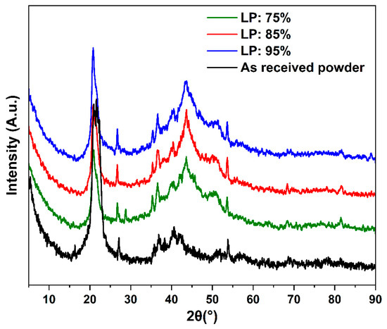 However, the degree of crystallization decreased from 46.62% (see Table 4) for the as-received powder to 35.11% for the sample sintered with 75% laser power. This difference could be attributed to a rapid cooling and less energy dissipation during the printing process. Moreover, the decrease in Tg from 51.7 to 44.07 °C as a result of sintering correlates strongly with the degree of crystallization of the sample. This can be attributed to the gain in the mobility of the polymer chains as they are not partly anchored inside the crystalline domain.