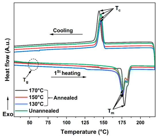 DSC data corresponding to the first heating–cooling scan for the different annealing temperature used.