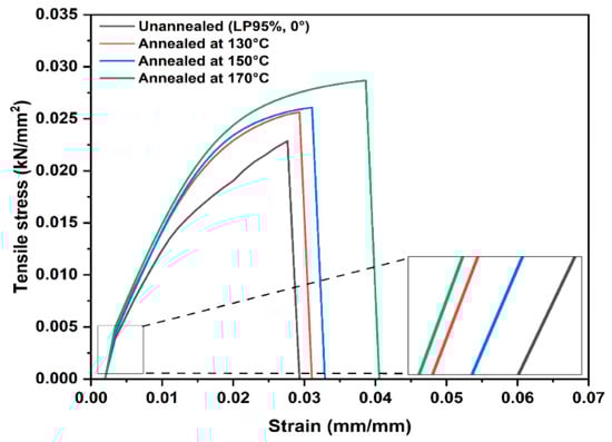 The annealed specimens were then subjected to mechanical testing to record the Young’s modulus, tensile strength, and strain at break. Figure 15 shows the typical tensile stress–strain curves of unannealed and annealed printed PA12 parts according to the various annealing conditions. All tested specimens exhibit a maximum of the stress/strain curve, followed by brittle deformation. The results indicate that tensile stress and its strain increases when the annealing temperature is increased from 130 to 170 °C. The annealed parts at 170 °C show the maximum tensile stress and strain compared to the unannealed samples. These results indicate the fact that heat treating the PLA12 parts at 170 °C for 6 h allows the material sufficient time for crystallization and the re-arrangement of the polymer chains.