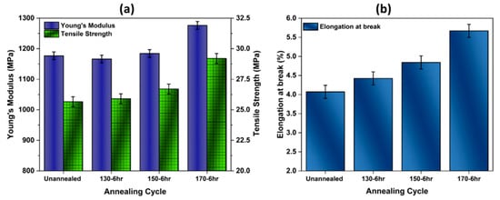 From the above results, it has been confirmed that high-temperature annealing (170 °C) yields the best improvement in Young’s modulus (+9 MPa, or ~8.4%), tensile strength (+3.7 MPa, or ~14.5%), and elongation at break (+1.59% MPa, or ~39%) over the unannealed parts. It can be concluded from these results that annealing had a higher percent contribution to the mechanical performance over the duration of annealing. This confirms the importance of the annealing process for achieving proper chain crystallization, thus enhancing the mechanical properties of 3D parts [58].