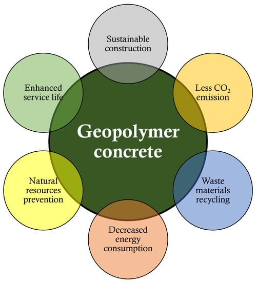 Geopolymer technology has a significant possibility for reusing waste materials, thus solving the problem of environmental pollution caused by the disposal of these items in landfills. In the domains of fire-resilient and asbestos-free materials, high-tech materials, new ceramics, and harmful waste-stabilization matrices, geopolymer-based products have been utilized []. Cement and concrete are essential to modern development because they facilitate the creation of the infrastructure required for a superior level of livelihood. It is believed that geopolymers provide a road for more commercialization, large-scale production, and a basis for rapid interpretation of research pertaining to comments regarding the eco-responsiveness of building materials. In addition, an evaluation of the optimal composition and transformation conditions must be conducted with respect to the geography and supply chains of raw materials [].