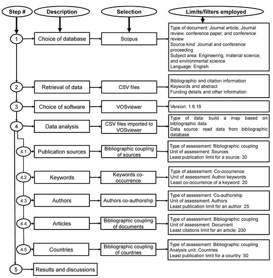 This study conducted a scientometric analysis of bibliographic data [,,] in order to quantify the numerous characteristics of bibliographic data. Scientometric studies utilize scientific mapping, a technique established by academics for bibliometric data analysis [,]. Numerous articles have been recorded on the subject; thus, it is essential to utilize a credible search engine. Web of Science and Scopus are two extremely precise databases that are ideally fit for this objective [,]. Scopus, which comes highly recommended by academics, was used to collect bibliographic information for this study on geopolymers. As of May 2022, a Scopus search for the term “geopolymers” yielded 10,115 results. Numerous filter settings were utilized to eliminate unnecessary papers. Figure 2 depicts a complete flowchart of the data retrieval, analysis, and numerous limits/filters applied during the analysis. Additionally, other studies have reported on the same method [,,]. Following the application of these filters to the Scopus database, 7468 results remained. Scopus records were stored in a Comma Separated Values (CSV) format for further assessment using the relevant software. VOSviewer (version 1.6.18) was utilized to construct the scientific visualization and quantitative evaluation of the obtained material. VOSviewer is a freely accessible, open-source mapping tool that is generally employed in distinct study areas and proposed by academics [,,]. Consequently, the current study’s objectives were met by the usage of VOSviewer. The resulting CSV file was loaded into the VOSviewer, and further evaluation was conducted while maintaining data consistency and reliability. During the scientometric analysis, the publishing outlets, the most frequently occurring keywords, the researchers with the highest number of published articles and citations, documents that received the most citations, and the state’s involvement were evaluated. The multiple features, their interrelationships, and co-occurrences were illustrated via maps, and their quantitative data were presented in tables. The color of an item in a map is determined by the cluster to which the item belongs. In addition, for the density visualization, there are various color options such as viridis, plasma, and rainbow, and this study used the rainbow option for density mapping.