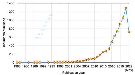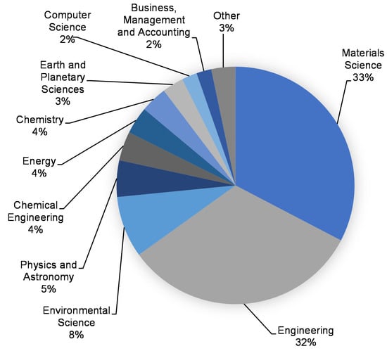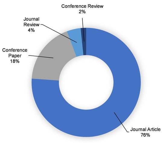 This assessment was performed using the Scopus analyzer to identify the most pertinent study fields. As seen in Figure 3, Materials Science, Engineering, and Environmental Science were determined to be the top three document-generating disciplines, with about 33%, 32%, and 8% of documents, respectively, contributing a total of 73% of documents. In addition, the Scopus database was analyzed for the kind of publications containing the documents on the subject research area (Figure 4). Based on this assessment, journal papers, conference articles, journal reviews, and conference reviews comprised around 76%, 18%, 4%, and 2% of all data, respectively. Figure 5 depicts the annual development of articles published in the current study field from 1983 to May 2022, since the first document on the subject research field was found in 1983. Up until 2000, there was almost a negligible growth in the publications in the field of geopolymers research, with an average of around two papers each year. Following that, there was a modest increase in the number of articles, with an average of around 91 articles each year between 2001 and 2015, with 319 articles in 2015. The number of publications increased significantly from 2016 onwards, with an average of 852 publications between 2016 and 2021, with 1288 publications in 2021. The quantity of publications is increasing each year, and in the current year, the number of publications on the subject research area is 724 so far (May 2022). It is fascinating to see that the researchers are focusing their attention on the use of alternative binders for construction materials.