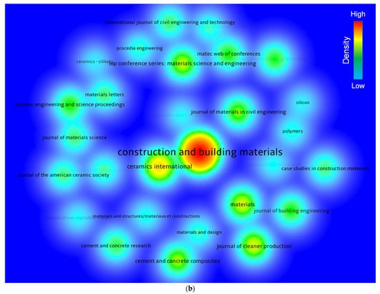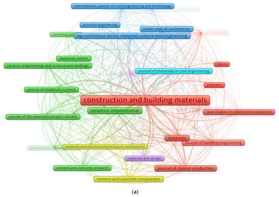 The evaluation of publication outlets (journals) was performed on the bibliographic data employing the VOSviewer tool. A minimum of 30 papers per source was stipulated, and 28 of the 753 sources satisfied this requirement. Table 1 displays the publishing outlets that released at least 30 publications on geopolymers research up to May 2022, along with the number of citations received within that time frame. “Construction and building materials (CONBUILDMAT)”, “Ceramics international”, and “Journal of cleaner production” were found to be the top publication journals with 770, 221, and 151 papers, respectively. Furthermore, the top three sources based on the number of citations received up to May 2022 are “CONBUILDMAT” with 34,289; “Cement and concrete research” receiving 12,256; and “Journal of materials science” with 9547 citations. Exceptionally, this examination would provide a groundwork for forthcoming scientometric evaluations in the research for geopolymers. Additionally, previous conventional review studies were unable of producing systematic graphs. Figure 6 depicts a visualization of sources publishing at least 30 articles. The frame dimension in Figure 6a is related to the outlet’s influence on the present study field based on document count; a bigger frame size indicates a greater impact. As an illustration, “CONBUILDMAT” has a larger frame than the others, indicating that it is a journal of great significance in the present research field. Six groups/clusters were formed, characterized by a distinct color on the map (blue, red, purple, yellow, cyan, and green). Groups/clusters are developed based on the extent of the research outlet or the frequency with which they are co-cited in comparable articles []. The VOSviewer grouped journals according to their co-citation tendencies in published articles. For example, the red cluster comprises nine journals that have been co-cited many times in the same work. In addition, the links between closely located frames (sources) in a group/cluster are greater than those between widely spread. For example, “CONBUIDMAT” correlates more strongly with “Case studies in construction materials” than with “Materials” or “Journal of building engineering”. As seen in Figure 7b, various shades correspond to varying density concentrations for a journal. Red has the highest density concentration, followed by yellow, green, and blue. “CONBUILDMAT” has a red shade implying its higher contribution to the research of geopolymers.