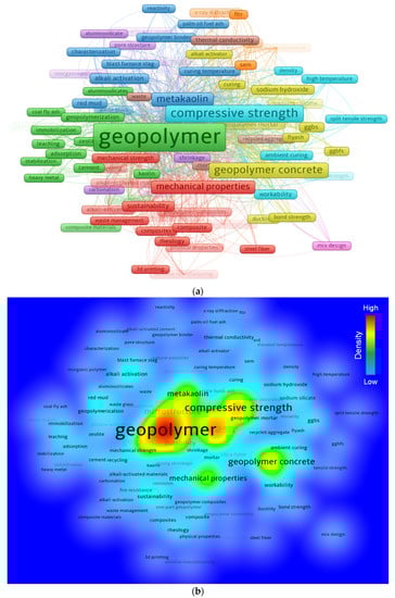 Keywords are significant in research since they distinguish and emphasize the basic subject of the study domain []. The minimum repetition requirement for a keyword was kept at 20, and 108 of the 7727 keywords were preserved. Table 2 records the leading 30 keywords most frequently used in published works on the subject. The five most often-occurring terms in the topic study field are geopolymer, fly ash, compressive strength, geopolymer concrete, and geopolymers. According to the keyword analysis, geopolymer has mostly been investigated to manufacture a sustainable construction material and is mostly researched to be produced from waste materials, such as fly ash, slag, silica fume, rice husk ash, etc. Figure 7 illustrates a systematic graph of keywords based on co-occurrences, connections, and density proportional to their occurrence frequency. A keyword’s frame size in Figure 7a signifies its frequency, while its position suggests its co-occurrence in articles. In addition, the graph expresses that the top keywords have larger frames than the rest, signifying that these are essential keywords for a real investigation in the research of geopolymers. The graph highlights clusters in a manner that shows their co-occurrence in a variety of published documents. The color-encoded grouping is determined by the co-occurrence of several keywords in publications. Nine clusters are represented by diverse shades in Figure 7a. As observed in Figure 7b, distinct colors represent differing keyword density concentrations. The shades red, yellow, green, and blue are arranged according to their density strengths, with red representing the highest density concentration and blue representing the lowest. Geopolymer, fly ash, compressive strength, and other prominent keywords display red or yellow signals indicating a greater density of occurrences. This finding will help ambitious researchers select keywords that ease the discovery of published papers on a specific topic.