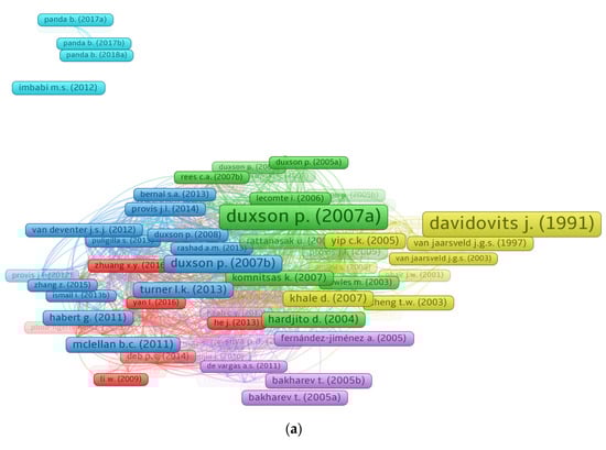 Citations show a scientist’s impact in a particular field of research []. The lowest paper threshold for a researcher was decided at 25, and 55 out of 9855 researchers satisfied this requirement. The authors with the most articles and citations in the field of geopolymers, as assessed from the bibliographic data using VOSviewer, are included in Table 3. Each author’s average citations were determined by dividing the total citations by the total number of articles. It is complicated to assess the effectiveness of a scientist when all parameters, such as the quantity of documents, overall citations, and average citations, are taken into account. Alternatively, the researcher’s ranking will be evaluated separately for each component, i.e., the number of documents, the number of overall citations, and the average number of citations. The analysis revealed that Van Deventer J.S.J. and Chindaprasirt P. are the most prolific researchers with 93 publications each, followed by Provis J.L. with 86 and Abdullah M.M.A.B. with 79 publications. In terms of total citations, Van Deventer J.S.J. leads the field with 18,335, Provis J.L. is second with 15,257, and Lukey G.C. is third with 9891 overall citations in the present research domain. In addition, when the average number of citations is compared, the authors might be ranked as Lukey G.C. at the top with nearly 341 average citations, Van Deventer J.S.J. at second with about 197, and Provis J.L. is third with approximately 177 average citations. Figure 8 depicts the association between writers with at least 25 publications and the most notable authors. Figure 8a depicts the scientific mapping of scholars who have contributed at least 25 papers to the current field of study. Figure 8b depicts the largest group of related writers based on citations, which consists of 44 of the 55 authors. This investigation indicated that the majority of researchers working on geopolymers are linked via citations.