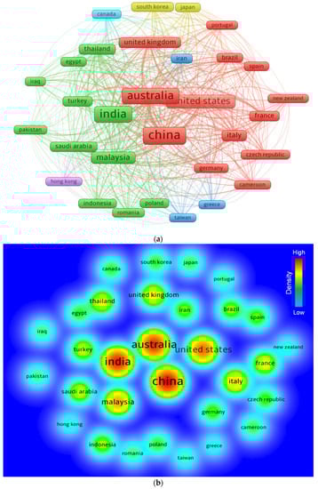Science mapping of countries with minimum of 50 publications. (a) Network map; (b) density.