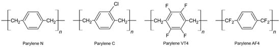 In this study, four parylene types (N, C, VT4, AF4) were selected and characterized. The chemical structure of each type is illustrated in Figure 1.