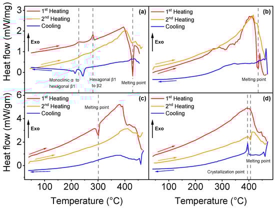 Three phase transitions were found for parylene N. Figure 2a shows a sudden heat flow change in the first heating curve at 430 °C, which corresponds to the melting point (endothermic process). The melting temperature has been reported previously between 410 and 430 °C [,,,]. In addition to the melting point, two exothermic phase transitions were determined for parylene N in the first heating curve: the first at 228 °C, which corresponds to the transition from the monoclinic α phase to a hexagonal β1 phase, and the second occurs at 281 °C, from hexagonal β1 to β2, as formerly observed and described in detail by Miller et al. []. The difference between β1 and β2 phases is still not completely understood, but previous works suggest a shortening of the c axis of the unit cell [,]. Parylene VT4, illustrated in Figure 2b, exhibits a melting point at 435 °C, but the polymer starts to degrade above 300 °C. Parylene VT4 thermal properties are difficult to be confirmed since parylene VT4 has been synthesized recently compared with the other types, and related studies are rare. Nevertheless, Senkevich et al. found a melting point at 402 °C []. The melting point of parylene C has been detected at 301 °C, as illustrated in Figure 2c; that value is close to 290 °C, as mentioned in the literature [,]. Finally, in Figure 2d, no phase transition was identified for parylene AF4 after one heat cycle up to 470 °C. However, during the cooling process, the polymer reveals a crystallization point at 395 °C, and the second heating cycle indicates a melting point at 406 °C. That result can be related to an observed reversible crystalline phase transition around 400 °C []. A second heat cycle (orange curves) was applied to each parylene type, but it did not reveal additional information, except for parylene AF4, as mentioned above.