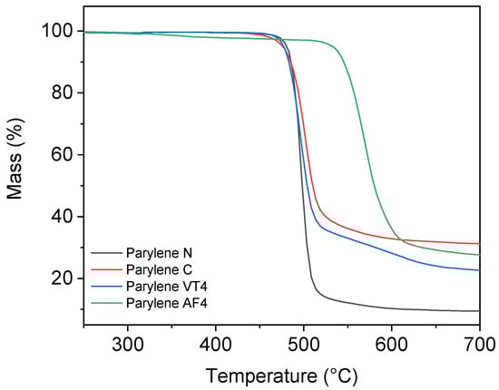 Thermogravimetric analysis (TGA), which measures weight changes in a material as a function of temperature under a controlled atmosphere, was used to determine the decomposition and transformation temperatures of our parylene films. For that purpose, the films were heated up to 800 °C with a heating ramp of 10 K/min under a nitrogen environment. The equipment, TG 209 F1 Libra (NETZSCH-Gerätebau GmbH, Selb, Germany), used for the measurements requires a minimum amount of film material of 5 mg.