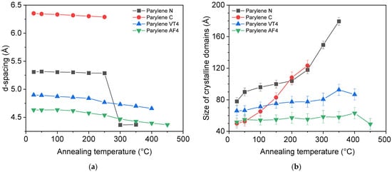 Atomic-scale structural analysis performed at room temperature for each type of parylene: (a) the d-spacing (Å) as a function of the annealed temperatures; (b) the size of the crystalline domains (Å) as a function of the annealed temperatures.