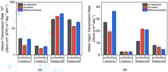 Two different permeation measurement techniques were used to quantify the parylene films’ permeability: the helium transmission rate (HTR) and the water vapor transmission rate (WVTR). Those two values were evaluated for three different conditions: as-deposited (no post-treatment applied), after the annealing process, and after the reflow soldering process under an oxygen-containing environment. The black columns show the results when no post-treatment was applied, while the blue and the red columns display the results after the annealing and reflow processes were performed, respectively. The annealing temperature is 300 °C for all parylene types (except 250 °C for parylene C) under a nitrogen environment. The reflow temperatures are 150 °C, 200 °C, and 300 °C for parylene N, C, and both F, respectively, under an oxygen-containing environment. The results presented in Figure 5 are normalized to a 25 µm thick parylene film, and the applied treatment temperature for each parylene film is written below the column.