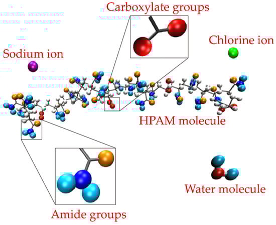The HPAM solution models were created using the Materials studio 2017 package (Accelrys Software Inc., San Diego, CA, USA). Then, 8% of the amide monomer of a PAM section was randomly replaced by a sodium carboxylate monomer to convert the PAM chain in HPAM (DA = 8%). In this work, HPAM molecules were modeled with the OPLS-AA force field (all-atom optimized potentials for liquid simulations) [30], and the SPC/E water model was used to describe the behavior of water [31]. The Lennard–Jones parameters 12–6 of Li and Mertz [32] were used for all ions.