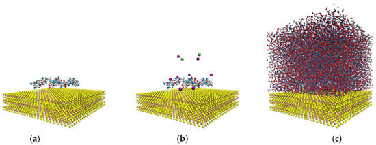 Molecular dynamics simulation setup. (a) Molybdenite face with two hydrolyzed polyacrylamide (HPAM) molecules; (b) molybdenite face with two HPAM molecules and sodium and chlorine ions; (c) molybdenite face with two HPAM molecules, sodium and chlorine ions, and water molecules.