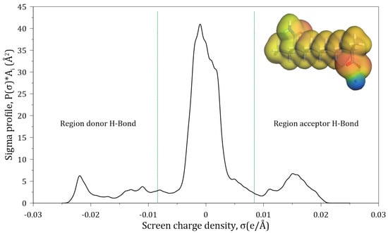 In the COSMO-RS, sigma profiles provide essential information about an ionic compound’s tendency to make and accept hydrogen bonds [37]. In this work, the cutting region considered for hydrogen bond accepting is σ_HB < −0.0084 e/Å2, and for hydrogen bond donning is σ_HB > +0.0084 e/Å2. The sigma profiles of the molecules found within this region are non-polar in nature [37,38,39].