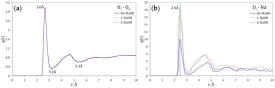 Since both the carboxylate and amide groups of the HPAM display polarity, it is expected that hydration shells and electrostatic interactions with ions and molecules may take place. To study these phenomena, the radial distribution functions (RDFs) of both the oxygen (Ow) atom of the water molecules and the sodium ion (Na+) dissolved in water, interacting with the carboxylate group of the HPAM, were calculated at different concentrations of NaOH. Figure 4a shows that the maximum probability of interaction between the Ow and the carboxylate group occurs at 2.6 Å, and that the first hydration layer around the carboxylate anion ends at 3.2 Å (3.1 Å [40] and 3.4 Å [41]). A second hydration layer is also observed, which ends at 5.3 Å (5.4 Å [40]). Figure 4b shows that the maximum probability of interaction between Na+ and the carboxylate group occurs at 2.4 Å (2.3 Å [40]), indicating that this cation can enter through the first hydration layer located around the carboxylate anion. Furthermore, the variation of the intensities of the peaks located at 2.4 Å indicates that the probability of finding sodium ions around the carboxylate groups increases with the sodium concentration.