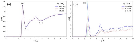 Radial distribution functions (g(r)) of (a) Ow and (b) Na+ interacting with the carboxylate group of the HPAM at varying concentrations of NaOH.