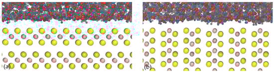Images of molybdenite/water interfaces: (a) molybdenite face; (b) molybdenite edge. The atoms’ color codes are as follows: S, yellow; Mo, pink; H, blue; O, red.