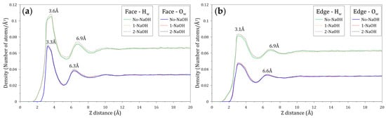 The distribution of water molecules around the faces and edges of molybdenite was studied by calculating the density profiles of the oxygen (Ow) and hydrogen (Hw) atoms of water molecules located along the Z axis normal to these mineral surfaces. Figure 7 shows the atomic density profiles of Ow and Hw calculated at varying NaOH concentrations. Figure 7a,b indicate that the interactions between the Hw and Ow atoms and the molybdenite face start around 1.5 and 2.4 Å, respectively, while the interactions of these atoms with the edge arise at 1.2 and 2.0 Å, respectively. As expected, these results indicate that the water molecules tend to be closer to the edge, which agrees with the hydrophilic character of this mineral surface. The presence of the Ow and Hw atoms is observed at farther distances from the molybdenite faces.