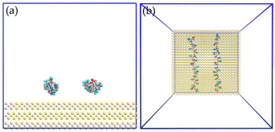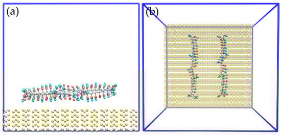 Figure 2 shows the configuration of the system to study the interactions of the HPAM with the molybdenite face. Initially, the system was simulated in a NVT configuration (a constant number of particles N, volume V, and temperature T) for 100 ps at 298 K; then, the production step was carried out in a simulation NVE configuration (a constant number of particles N, volume V, and energy E) for 10 ns at 298 K, and the data were collected every 20 ps.