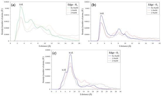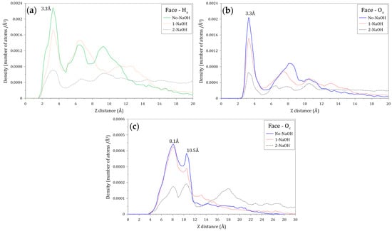 Figure 10 shows the atomic density profiles of the hydrogen (Ha) and oxygen (Oa) atoms of the amide group, and the oxygen (Oc) atom of the carboxylate group in the vicinity of the molybdenite face, calculated at different NaOH concentrations. Figure 10a,b indicate that the interactions between the Ha and Oa atoms and the molybdenite face start at around 1.5 and 2.7 Å, respectively. Figure 10a shows that the first peak of Ha is displayed at 3.3 Å from the surface, which indicates that most of these atoms interact at this distance with the molybdenite face. There are several Ha peaks beyond 3.3 Å, which reveals the presence of other layers of HPAM molecules. It is worth noting that the intensity of the different peaks decreases in the presence of NaOH molecules, indicating some effect of the ions on the HPAM adsorption on the face. Figure 10b shows the atomic density profiles of the Oa atoms, which display a sharp peak around 3.3 Å, and that the atomic density decreases with the increase of the NaOH concentrations. Figure 10c shows the atomic densities of the Oc atoms that show two major peaks at 8.1 and 10.5 Å, which indicates that the interactions between the molybdenite face and the carboxylate group are weaker than those with the amide group. It can also be seen that the interactions of the carboxylate group with the mineral face start at 3.9 Å. A substantial reduction of the peak intensities can be seen when 2 NaOH molecules are added, causing the highest number of Oc atoms to be located 10.5 Å from the molybdenite face, which indicates that the increase in NaOH causes the carboxylate groups of the flocculant to move away from the surface of the mineral face. All these results indicate that the interaction between the HPAM and the molybdenite face occurs mainly through the interaction of the amide group with the basal planes of the mineral.
