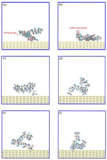 Snapshots of the mineral face/HPAM interfaces: (a) No-NaOH, t = 0.1 ns; (b) No-NaOH, t = 10.0 ns; (c) 1-NaOH, t = 0.1 ns; (d) 1-NaOH, t = 10.0 ns; (e) 2-NaOH, t = 0.1 ns; (f) 2-NaOH, t = 10.0 ns. Na+, Cl−, and OH− ions are not shown to facilitate the visualization of HPAM molecules.