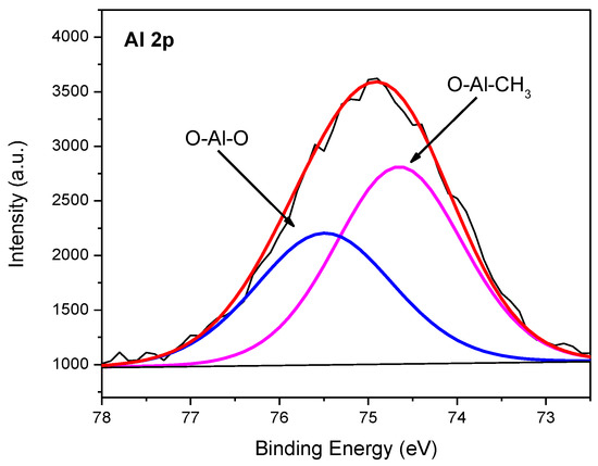 In order to further explore the specific grafting mode between the homogeneous catalysts and supports, we took the supported catalyst S-C1-a as an example to carry out X-ray photoelectron spectroscopy characterization, and the results are shown in Figure 1 and Figure 2. The peaks at binding energy (BE) of the supported catalyst were about 285, 400, 75, 859, 102 and 533 eV, which were attributed to C 1s, N 1s, Al 2p, Ni 2p3, Si 2p and O 1s. For SiO2-supported catalysts, the absorption signals of Si 2p and O 1s were very strong, which was related to the large amount of silicon and oxygen on the surface of SiO2. In addition, the Al element in the activated supports is an important connection element between the homogeneous catalyst and the supports. Figure 2 shows the Al 2p level spectrum of covalently supported catalyst. It can be seen that the absorption of Al 2p occurs at approximately 75.5 eV and 74.7 eV, which were attributed to O-Al-O and O-Al-CH3, respectively [43]. Among them, the absorption peak of O-Al-O at 75.6 eV indicated that the α-diimine nickel(II) catalyst had been successfully grafted to SiO2 through the covalent bond.