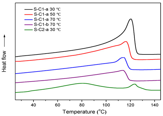 The polyethylenes are determined by differential scanning calorimetry (DSC). The melting temperature (Tm) and crystallinity data of the polyethylenes are summarized in Table 2 and Table 3. The DSC curves are in the Figures S3–S6 of the Supporting Material. Compared with the polyethylene obtained by the homogeneous catalyst C1 [40], which has low or even no melting point, the polyethylenes obtained by the supported catalysts S-C1-a/b have higher melting points and are above 110 °C, due to the inhibition of the support to the chain walking reaction during the polymerization process. Following the same trend as other reported α-diimine nickel(II) catalysts, the melting point of the obtained polyethylenes decreased with the increased polymerization temperature (Figure 5). This is due to the acceleration of chain growth and chain walking at higher temperatures, resulting in the formation of more branches that hinder the crystallization of the polymer. No significant influence of different silica gel on the melting point of resultant polyethylene under the same polymerization condition for the S-C1-a/b catalytic systems. At 70 °C polymerization temperature, the melting point of polyethylene obtained by S-C1-a is 114 °C, and that of polyethylene obtained by S-C1-b is 113 °C.