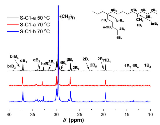 As shown in Figure 6, when the temperature increased from 50 °C to 70 °C, the branching degree of polyethylene prepared using the catalyst S-C1-a increased from 67/1000C to 78/1000C while the resonances of methyl branch chain increased. Meanwhile, other branch chains decreased as the temperature increased. At the same polymerization temperature of 70 °C, although the branching density of polyethylenes obtained from S-C1-b (82/1000C) is slightly higher than that of S-C1-a, the resonances of other branch chains except methyl chain increased significantly. This phenomenon may be related to the difference of the support type, specific surface area and nickel content of the two supported catalysts, which greatly affects the mechanism of chain walking.