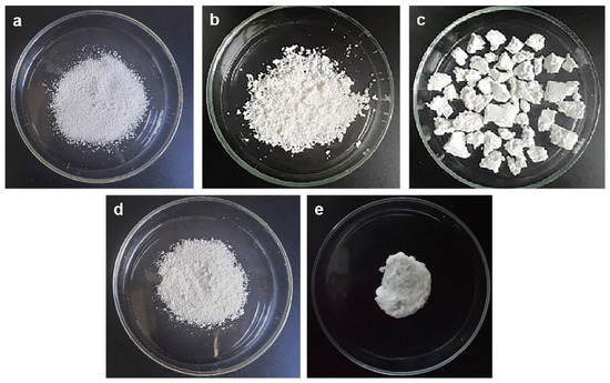 Photographs of polyethylenes obtained with ((a), S-C1-a 30 °C; (b), S-C1-a 50 °C; (c), S-C1-a 70 °C; (d), S-C1-b 30 °C; (e), homogeneous catalyst C1 30 °C).