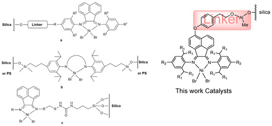 Supported α-diimine nickel(II) catalysts. (a): [27]; (b): [28]; (c): [29].