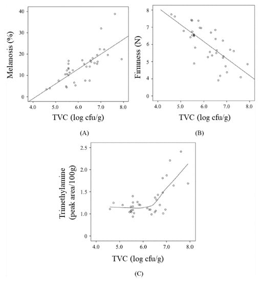 Interrelation of total viable count on changes in (A) melanosis, (B) firmness, and (C) trimethylamine content of shrimp under a modified atmosphere during 12 h of storage at 4 °C (Reproduced with permission from Kimbuathong et al., 2019 [10]).