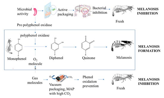 Melanosis formation through polyphenol oxidation and its prevention via microbial inhibition and O2 removal using packaging technology.