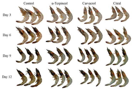 Packaging systems integrated with active compounds are now widely developed to preserve crustaceans, particularly shrimp, by inhibiting melanosis formation on the carapace. MAP with a high CO2 concentration to prevent melanosis in shrimp [10,35], while Laorenza and Harnkarnsujarit (2021) [37] developed a PBAT/PLA active film containing carvacrol, citral, and α-terpineol essential oils to prevent melanosis. Alparslan et al. (2016) [36] also reported that edible coatings prepared from gelatin containing orange leaf oil retained a high L* value, indicating that melanosis was prevented. Application of packaging technology prevented melanosis in shrimp by minimizing oxidation and growth of melanosis-stimulating microbes.
