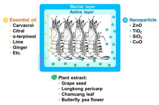 Plant extracts with antioxidant properties incorporated into polymers as seafood packaging were also reported (Figure 4). Lopes et al. (2021) [67] loaded potato peel extract onto starch film. The 2,2′-azino-bis-3-ethylbenzthiazoline-6-sulphonic acid (ABTS) inhibition of the film was measured at 56–85% within 7 days and increased the golden color of smoked sea bream fillet. Grapefruit seed extract incorporated with sodium alginate retarded the microbiological limit of shrimp for up to 4 days longer than the control, with lower TVB-N, pH values, and off-flavors due to dispersion of nanoparticles from the packaging to the shrimp [82]. Nagarajan et al. (2021) [83] developed an active coating prepared from gelatin and chitosan incorporated by longkong pericarp extract. They found that the active coating effectively inhibited melanosis and polyphenol oxidase activity of black tiger shrimp, while lipid (TBARS, peroxide value, and anisidine value) and protein oxidation (loss of sulfhydryl group) were inhibited. These results indicate that the incorporation of plant extracts rich in antioxidants into polymers has the potential to preserve the quality of shrimp. However, further investigation is required regarding the stability of plant extracts, particularly thermal and oxidative degradation.