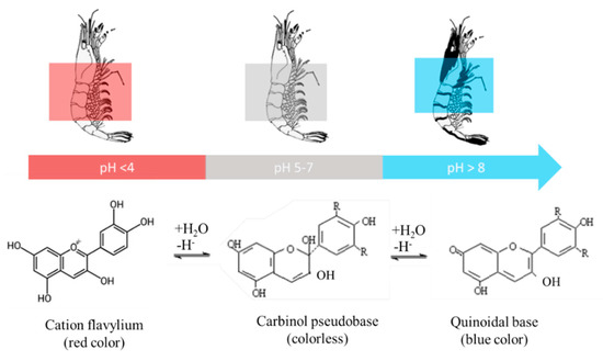 Mechanism of color change in pH−sensitive anthocyanins to monitor shrimp freshness (adapted from Zhao et al. 2022 [106] and You et al. 2000 [102]).