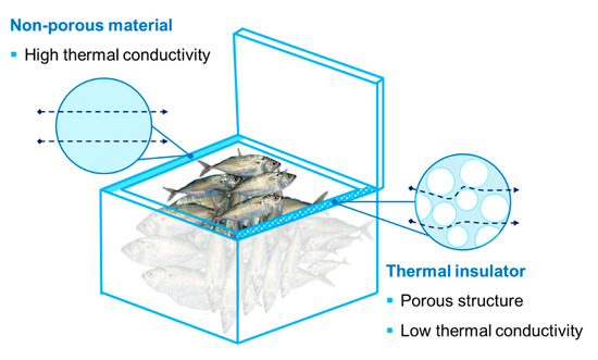 Maintaining the freshness of seafood products is important, particularly during handling and distribution. The cold chain system is the main stage for the fresh seafood product supply chain until it reaches the consumer safely. Low temperatures are mostly obtained by ice (flake ice, tube ice, block ice, crushed ice). However, packaging equipped with thermal insulation is necessary to stop the ice from melting during storage and distribution. Expanded polystyrene, polyurethane foam, and expanded polyurethane foam are common thermal insulators used for cold chain distribution [133]. They contain many pores filled with air and have very poor thermal conduction properties that inhibit the flow of heat energy (Figure 7). Sormin et al. (2016) [134] reported that Styrofoam had better cool temperature maintenance, resulting in a faster cooling rate of fish (0.13 °C/min) compared to the cool box insulator “ela sago” (0.045 °C/min). Patents for insulator boxes for fisheries’ products are listed in Table 4.