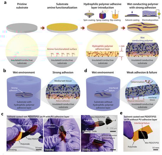 The weak and unstable adhesion of CPs to substrates can lead to CP debonding or reduced reliability and efficacy of flexible devices []. Some methods have been reported to enhance CP adhesion, including the topological modification of substrates and electrodeposition. To achieve strong adhesion in flexible devices, a simple method has recently been applied to various wet CPs, including PE-DOT:PSS, PPy, and PANI, on diverse, flexible substrates, including glass, polyimide, PDMS, and indium tin oxide (ITO) (Figure 2) []. In this method, a hydrophilic polymer adhesive layer with nanoscale thickness was introduced for the pretreatment of the substrate; this layer not only provided strong substrate adhesion but also penetrated the polymer network. In addition to utilizing a broad range of substrate materials, such approaches can be implemented using different coating techniques. The results have indicated that owing to the strong and stable interfacial adhesion between CPs and different substrates, this method can be utilized for commercial CPs and is compatible with various other fabrication techniques, such as solvent casting and electrodeposition.