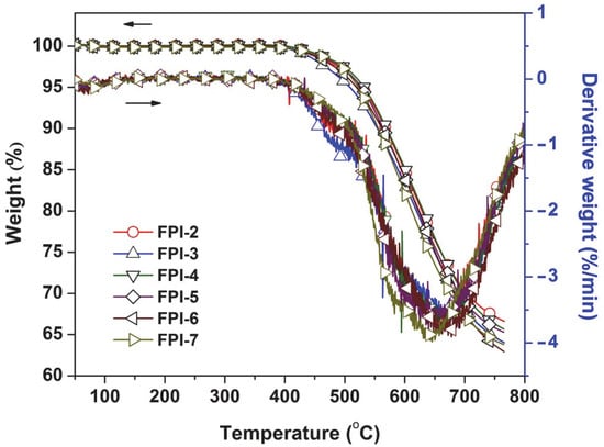 The standard negative auto-sensitive PSPI derived from BTDA and TMMDA (PI-1 in the current work) is known for the high thermal stability, including the high initial thermal decomposition temperatures (5% weight loss temperature, T5% > 500 °C in nitrogen) and high glass transition temperatures (Tg > 340 °C) [17]. This is mainly attributed to the good thermal stability of benzophenone units in the dianhydride moiety and the sterically hindering effects of multi methyl groups in the diamine moiety. However, the PSPI (BTDA-TMMDA) presented a slightly higher CTE value (56.5 × 10−6/K, 50 × 250 °C) for practical applications. It can be anticipated that incorporation of MABTFMB components could maintain the intrinsic thermal stability of PSPI (BTDA-TMMDA) while efficiently decreased the CTE value of the polymer due to the existence of the rigid benzanilide and biphenyl units in the monomer. The thermal stabilities of the PI films were investigated by TGA and TMA measurements, respectively and the thermal data are summarized in Table 3. As could be seen from the TGA plots of the polymers shown in Figure 5 that the FPI films showed T5% and Rw750 values in the range of 509–532 °C and 64–67wt%, respectively, which were close to those of PI-1 (T5% = 532 °C; Rw750 = 72%). For the FPI copolymers, the maximum thermal decomposition occurred in the temperature range of 600~700 °C, as could be observed from the derivative TGA (DTG) plots in Figure 5. Thus, the current modified polymers showed excellent thermal stability.