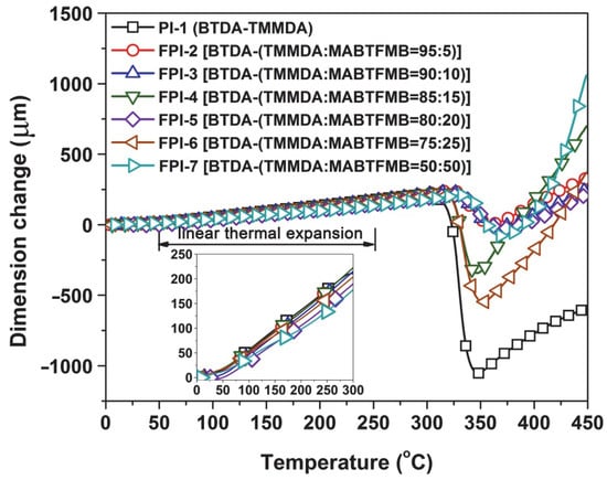 Although the currently developed FPI copolymers showed similar thermal stability with the pristine PI-1 (BTDA-TMMDA), the high-temperature dimensional stability was obviously increased. This could be deduced from the TMA plots of the polymers shown in Figure 6. First, it could be clearly observed that all the polymers exhibited thermally shrinking behaviors when the test temperatures were higher than Tg values of the polymers. For the high-temperature-resistant polymers, this high-temperature shrinkage beyond the Tg is usually considered to be a manifestation of the orderly arrangement of the molecular chain segments in the polymers. When the ordered arrangements finish, the dimension of the polymers will continuously expand with the increasing test temperature. The turning points of this dimensional change are usually recorded as the Tg values of the polymers. According to the records, the FPI copolymers showed the Tg values in the range of 348.0–370.6 °C, which were all higher than that of PI-1(BTDA-TMMDA) (Tg = 347.6 °C). It meant that the copolymers showed enhanced high-temperature dimensional stability after incorporation of MABTFMA components. This enhancement could be further quantitatively reflected by the CTE values of the polymers, as shown in Table 3. As expected, the CTE values of the polymers gradually decreased with the increasing contents of MABTFMB in the polymers. The FPI films showed reduced CTE values in the range of 40.7 × 10−6/K to 54.0 × 10−6/K in the temperature range of 50–250 °C. Undoubtedly, the improvement of the thermally dimensional stability of the copolymers could mainly be attributed to the rigid benzanilide and biphenyl units in the polymers. Considering the solution processability of the current copolymers, the CTE values as low as 40.7 × 10−6/K could efficiently expand their applications in advanced optoelectronic fabrications.