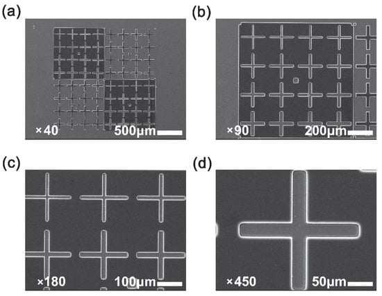 SEM photos of micro-patterns with different magnification formed by the photolithography process of FPI-7. (a) magnification times: 40 (×40); (b) magnification times: 90 (×90); (c) magnification times: 180 (×180); (d) magnification times: 450 (×450).
