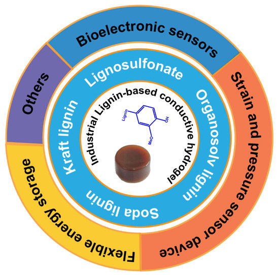 Generally, the common operating mechanism of conductive hydrogel for electronic devices is the external stimulus signals converted into electrical signals to realize the identification and detection of stimuli [71]. Sufficient conductivity, therefore, is essential for hydrogel electronic devices. In addition, stretchability, adhesion performance, bacteria, and UV resistance are also needed for the application of hydrogels in various fields [19]. Lignin contains abundant functional groups, which own excellent processability and reactivity. Meanwhile, lignin has great natural properties, such as biocompatibility, biodegradability, UV shielding, anti-oxidation, and antibacterial [19,72]. Industrial lignin, such as the aforementioned kraft lignin, soda lignin, lignosulfonate, and organosolv lignin, has been widely used in conductive hydrogels. In this section, we reviewed the most common applications of industrial lignin-based conductive hydrogels.