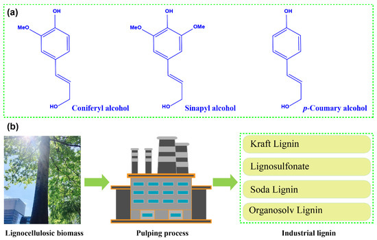 (a) Three monomers of industrial lignin. (b) Different pulping processes for the preparation of lignin derived from lignocellulosic biomass.