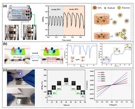 Han et al. developed a simple and low-cost method to prepare polyvinyl alcohol (PVA)/lignin–silver hybrid nanoparticles (Lig–Ag NPs) hydrogel-based piezoresistive sensors with superior mechanical performance and stable conductivity. The Lig–Ag NPs were formed due to the interaction between alkaline lignin and Ag NPs, which decreased the release of Ag NPs and generated stable semiquinone radicals in alkaline lignin. After compositing with PVA, Lig–Ag NPs provided a large amount of sacrificial hydrogen bonding and accelerated the delivery of electronic (Figure 5a). The obtained PVA/Lig–Ag NPs hydrogel presented outstanding pressure sensitivity, compressibility, and stability of signal response [76].
