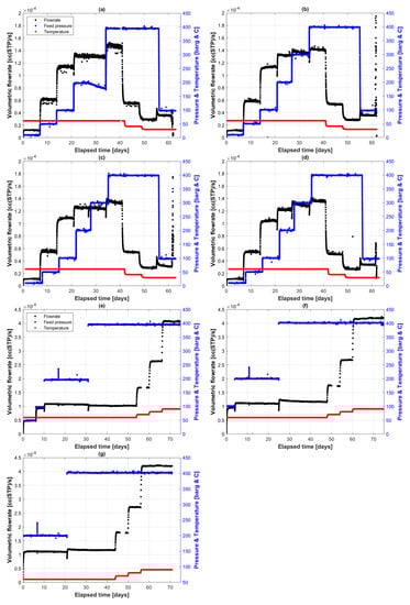 Volumetric flowrates of CO2 permeant to 2mm PE-RT film at various pressure and temperature steps, detected by a GC through constant N2 sweep. (a–d) First permeation round; (e–g) second permeation round. Black is flowrate, blue is pressure, and red is temperature.
