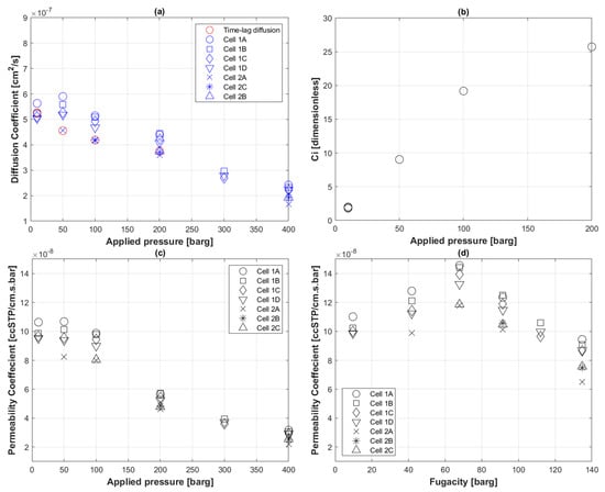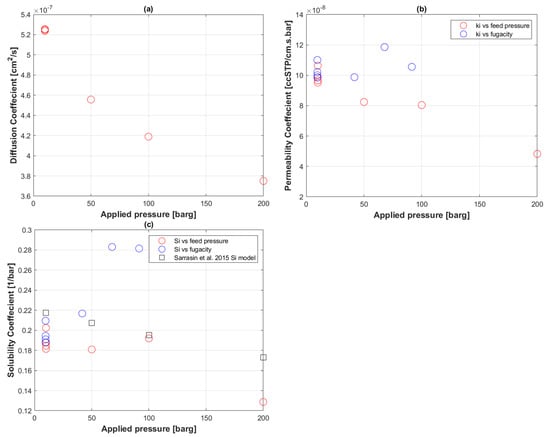 Figure 3 shows the transport coefficients summarizing all the permeation runs of PE-RT, where the diffusion coefficient was calculated using the standard time-lag method (Figure 3a) and the permeability coefficient was determined from the classical solution-diffusion model (Figure 3b). Figure 3c compares the calculated solubility coefficients to a solubility prediction by Sarrasin et al. [26] based on applied pressure.