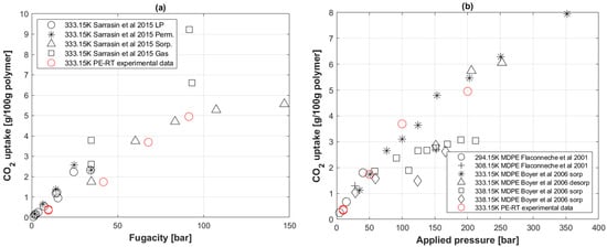 Figure 5a shows a comparison of CO2 uptake concentration in grams of gas per 100 g of PE-RT specimen to what was experimentally reported by Sarrasin et al. [26] with HDPE. The same data were then compared to those of Flaconneche et al. [62] and Boyer et al. [25] for CO2 uptake with medium-density polyethylene (MDPE) at similar temperatures.