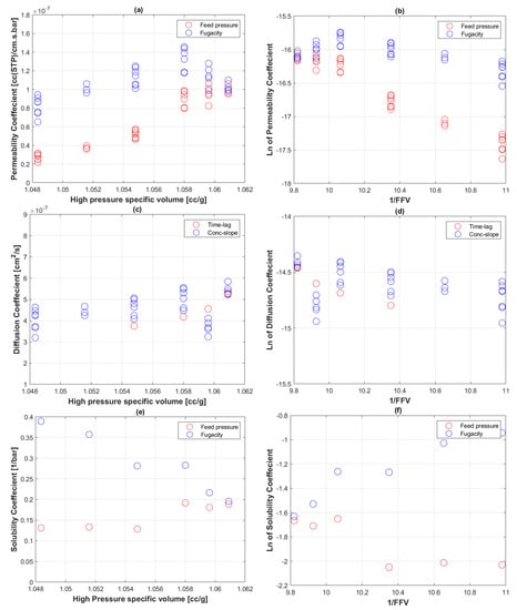 Figure 6 displays the profile of transport coefficients (permeability, diffusion, and solubility) against specific volume at high pressures and 1/FFV. The fractional free volumes presented were calculated from interpolations of published PE specific volume values at 0 MPa and 50 MPa at ranging temperatures [63]. Ideally, however, fractional free volumes of the specific PE-RT grade coming from PVT analysis should be used.