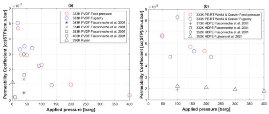 (a) Permeability coefficient of CO2 to PVDF compared to literature data [62]; (b) permeability coefficient of H2 to PE-RT compared to literature [58,62,64].